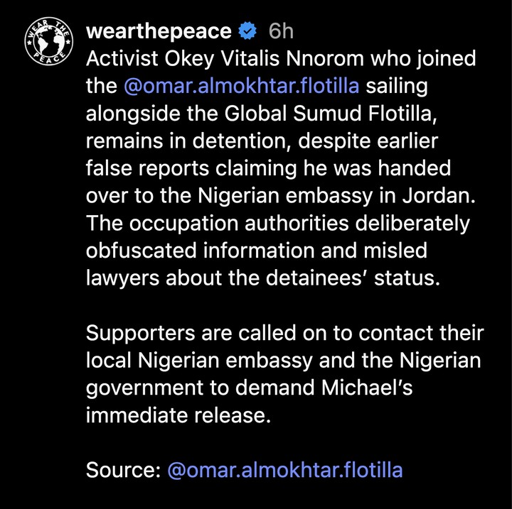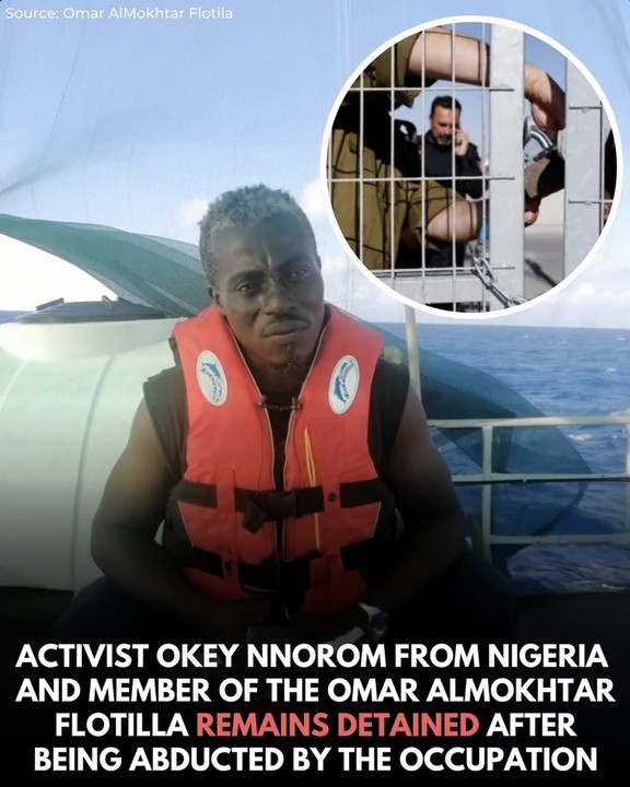 I am calling on Abike Dabiri-Erewa, Chairperson of the Nigerians in Diaspora Commission (NiDCOM), and on the Tinubu administration to immediately step in and facilitate the safe return and recognition of the Nigerian activist hero who participated in the Gaza Sumud Flotilla. This was not just another protest, it was a mission of moral courage. The Sumud Flotilla sailed in the face of military blockade, carrying nothing but humanitarian aid and the conscience of the world. Among those who braved that voyage was a Nigerian, a citizen who embodied the spirit of resistance, empathy, and international solidarity. If Nigeria can send peacekeepers abroad, we must also protect peace activists who stand up for justice globally. This is not a political issue, it’s a humanitarian and national pride issue. The world should see that Nigeria does not abandon her citizens who act on the right side of history. Abike Dabiri and the Ministry of Foreign Affairs must use every diplomatic and consular channel to ensure this activist’s welfare, safety, and recognition as a symbol of Nigerian conscience abroad. Let it be known that in a time of global silence, a Nigerian voice spoke, and Nigeria stood behind it. Tinubu, Minister Tuggar, Ambassador Bianca, and Abike Dabiri must urgently call on the Israeli Ambassador, Michael Freeman, to guarantee the safety of Okey Nnorom while he remains in IDF custody. Nigeria should also demand his immediate and unconditional release, just as other nations like Norway, Sweden, and the United Kingdom have successfully done for their detained citizens. Okey Nnorom stood for humanity; now humanity must stand for him. Salute to courage. Salute to humanity. Activist Okey Vitalis Nnorom who joined the Omar AlMokhtar Flotilla sailing alongside the Global Sumud Flotilla, remains in detention, despite earlier false reports claiming he was handed over to the Nigerian embassy in Jordan. The occupation authorities deliberately obfuscated information and misled lawyers about the detainees’ status. Supporters are called on to contact their local Nigerian embassy and the Nigerian government to demand Michael’s immediate release. https://x.com/WearThePeaceCo/status/1975960797323862368?t=hrDRnHf2n8cQvOmT69WIGw&s=19
