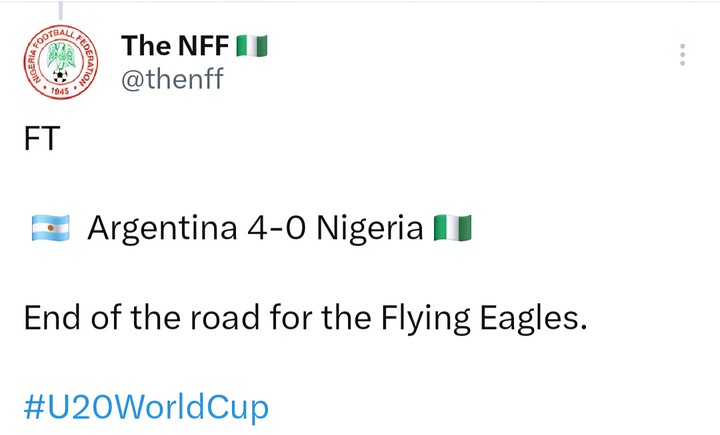 2025 U-20 WC: Flying Eagles Suffer Humiliating 4-0 Defeat To Argentina In Round Of 16 Clash